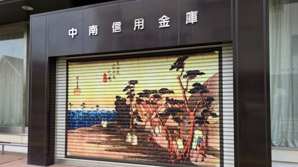 信用金庫のシャッターには浮世絵が描かれていました。