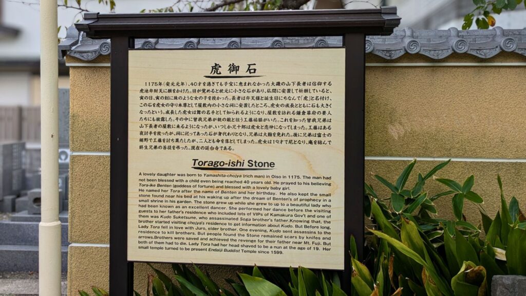 境内には、虎女供養塔や虎池弁財天の碑、子授け祈願の石仏など、虎御前にまつわる史跡がたくさん。特に虎御石は5月末に行われる「虎御石祭り」で御開帳されます。大願成就・厄除けなどにご利益があると言われていて、直接触れることができるそうです。
