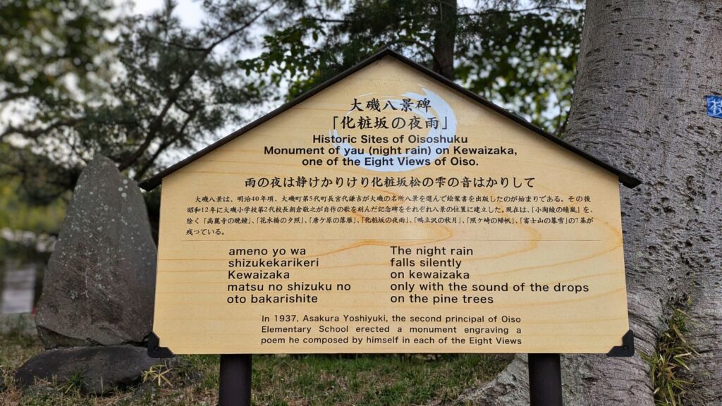 一里塚のそばには「大磯八景碑 化粧坂の夜雨」の碑があります。朝倉敬之自らが詠んだ句を刻んで自費で建立した「大磯八景碑」の一つです。