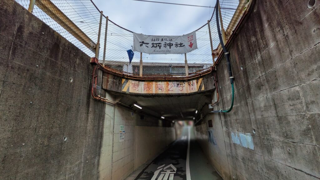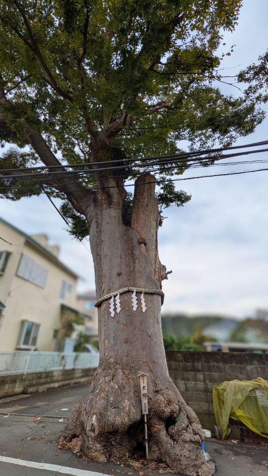 くぐり終えて、神社まで続く道の途中に、紙垂(しで)のついた存在感のある大木が現れます。根本の札には「樹齢600年」とあり、その迫力は圧巻です。自然が持つ圧倒的な力強さに、ただただ見入ってしまいますね。
