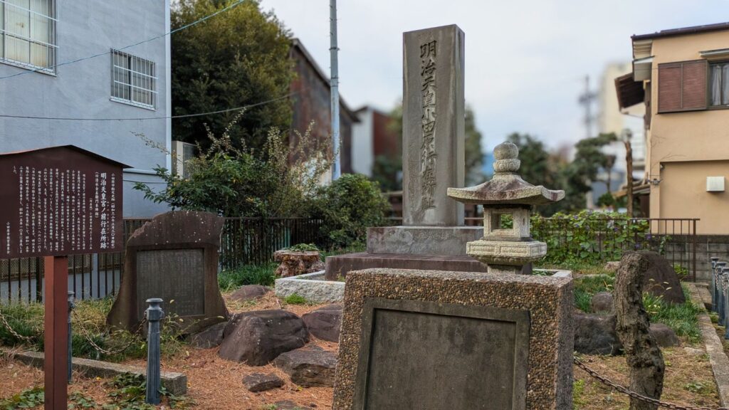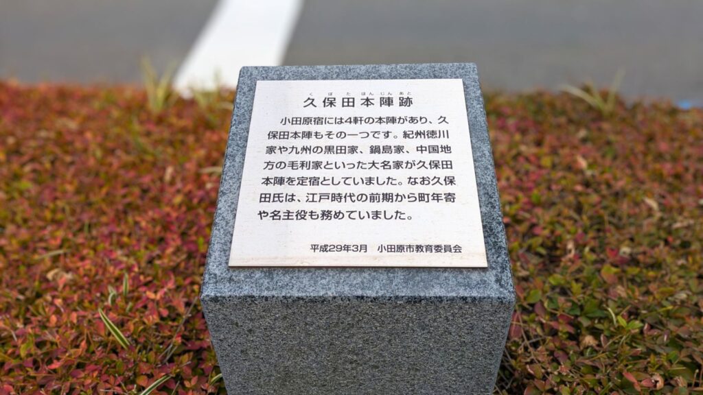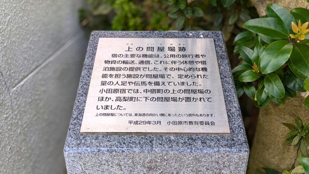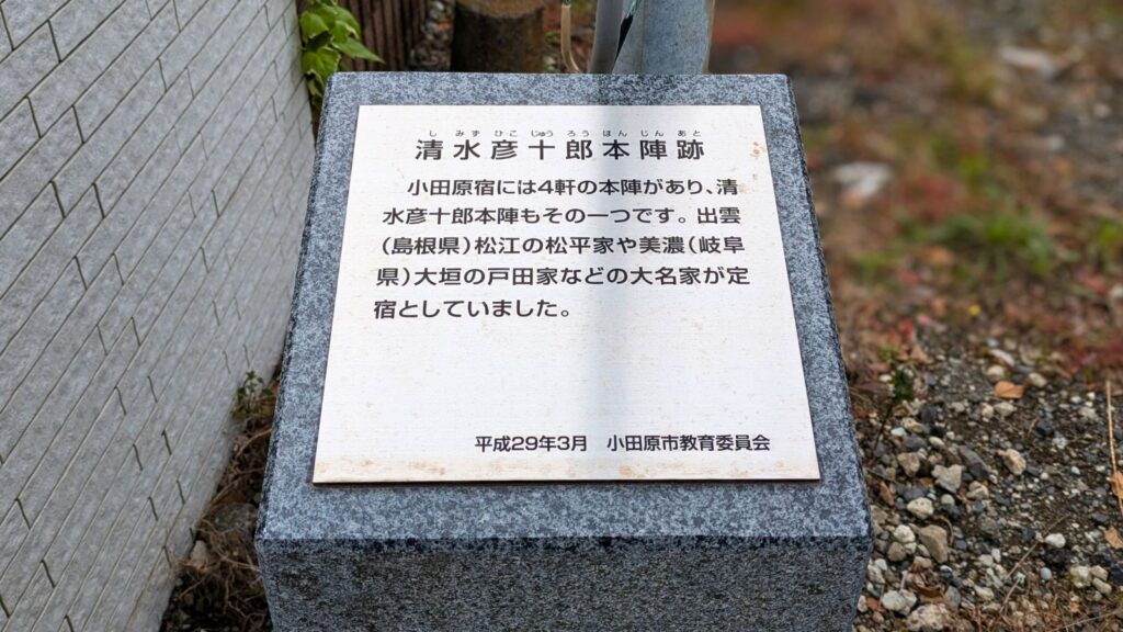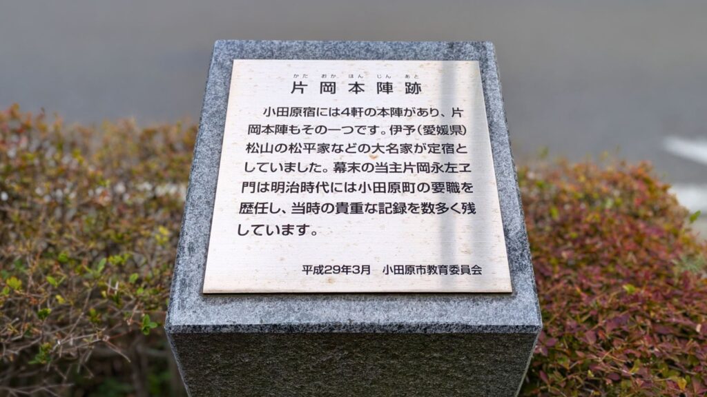 清水金左衛門本陣と並ぶ有力な本陣、片岡家の跡地です。こちらも明治天皇の行在所となった記録が残ります。本陣がこれほど密集していること自体が、小田原宿の規模の大きさと重要性を証明しています。