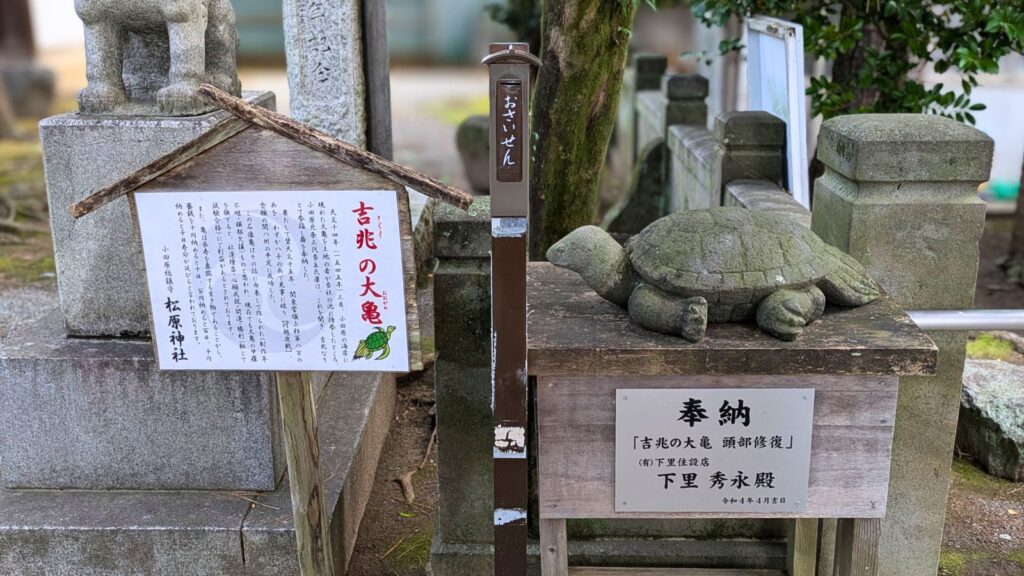 「吉兆の大亀」として有名で、境内には大亀の石像や大亀守があります。