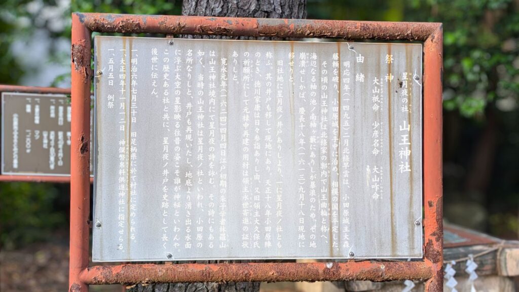 山王川沿いに静かに佇む「山王神社」。ここは徳川家康公が小田原攻めの際、しばしば戦勝祈願に訪れたといわれる由緒ある神社です。江戸時代の儒学者・林羅山が、この神社の風情を漢詩に詠んだことから、別名「星月夜(ほしづきよ)の社」なんていうロマンチックな名前でも呼ばれていたんですね。
