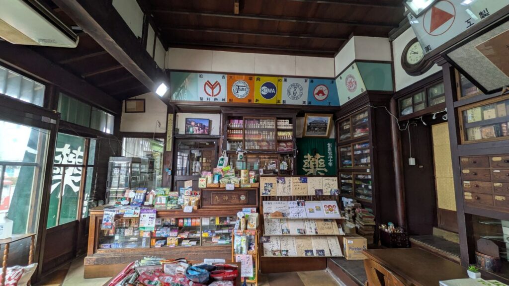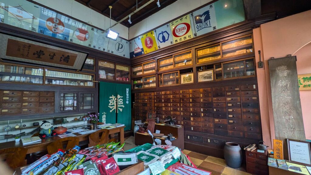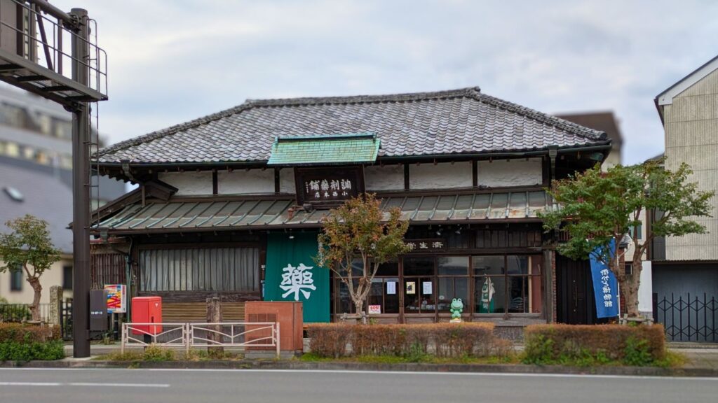 通り沿いで一際目を引くのが、この「済生堂薬局小西本店」です。創業は江戸時代初期に遡るという超老舗。現在の建物は大正時代に建てられたものですが、黒漆喰の壁や重厚な瓦など、当時の商家の美しさがそのまま残っています。なんと国登録有形文化財でありながら、現役の薬局として営業されているんです。