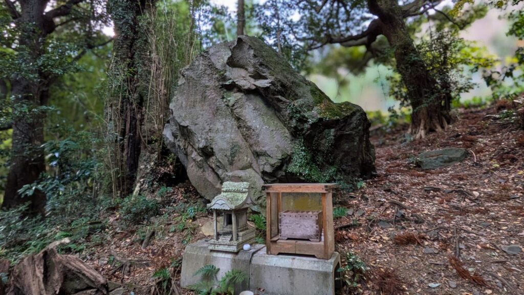 白山神社の境内、社殿左前方に立つ金色の鳥居が目印。その奥の坂を少し上ると、圧倒的な存在感を放つ巨岩が現れます。苔むした大きな岩からは、自然のパワーがビシビシ伝わってきます。知る人ぞ知るパワースポットです。
