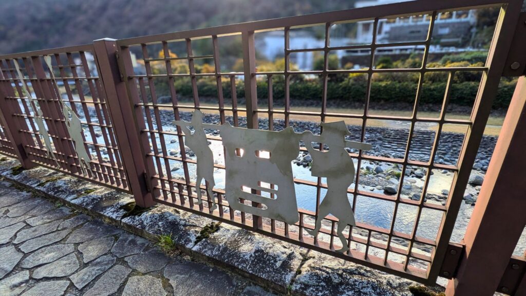 三枚橋に続く欄干には、参勤交代を表現したしたシルエットのプレートが並びんでいます。