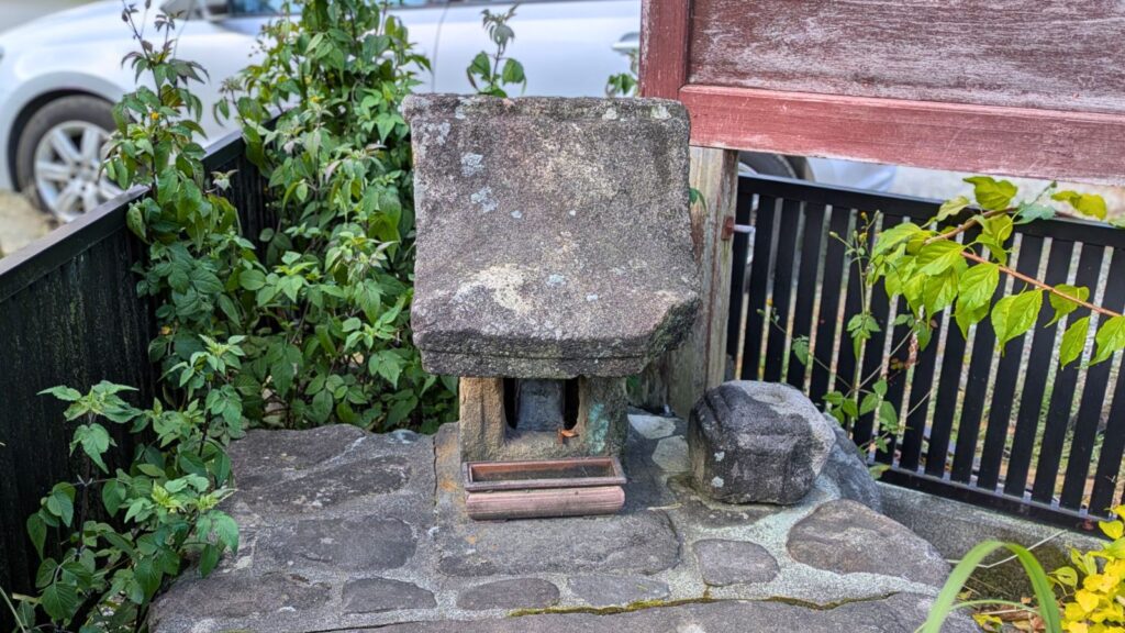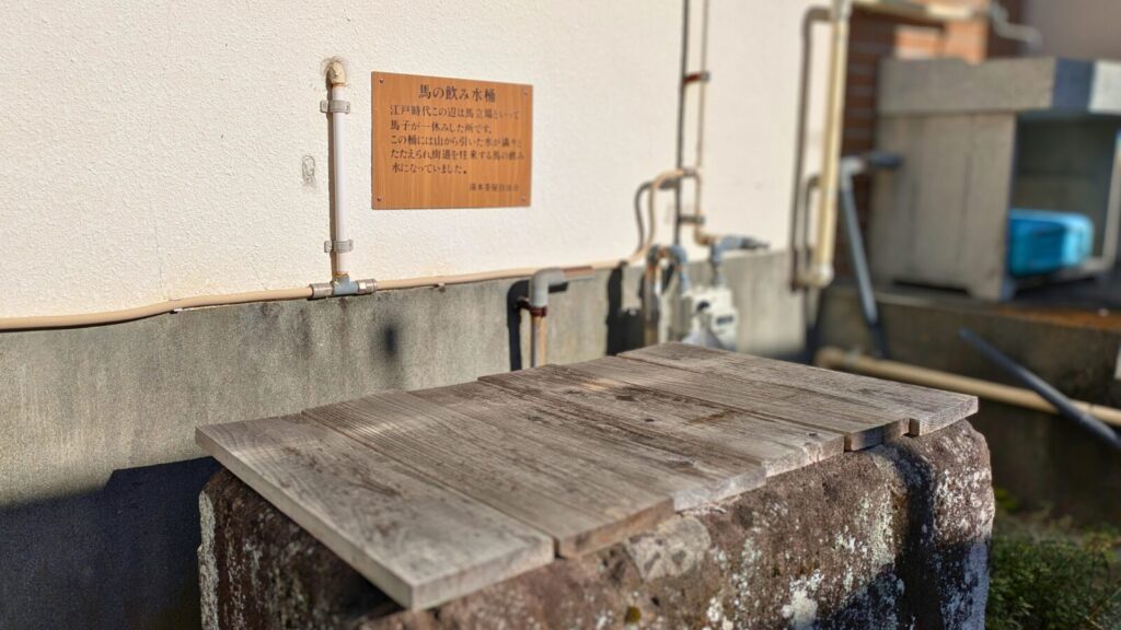 石畳案内板のすぐ向かいにあるのが「馬立場」がありあます。ここは急坂の手前で地名が示す通り、馬を休ませたり、荷物を積み替えたりした場所です。馬に水を飲ませるために使われていた石造りの桶が残っています。ここから先は、人も馬も気合を入れ直さなければならない区間だったのでしょうね。