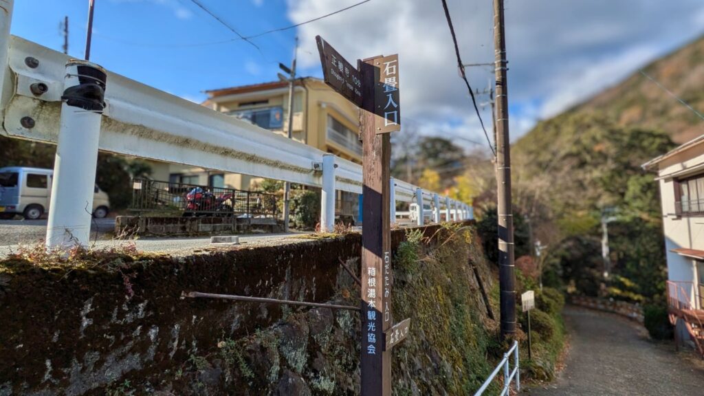 その少し先に「石畳入口」の案内板があります。旧街道が色濃くなってきます。箱根越えもいよいよ本格的になってきます。