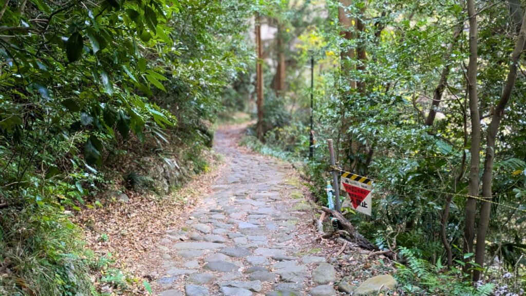 山道に入ると、舗装路から石畳へと道が変わります。足元に神経を使いながらも、日本三大仇討ちの一つ「曽我兄弟の仇討ち」の物語が残る史跡を巡ります。この辺りから湿気を含んだ苔むす石畳が現れ、まさに「難所」の雰囲気を肌で感じました。