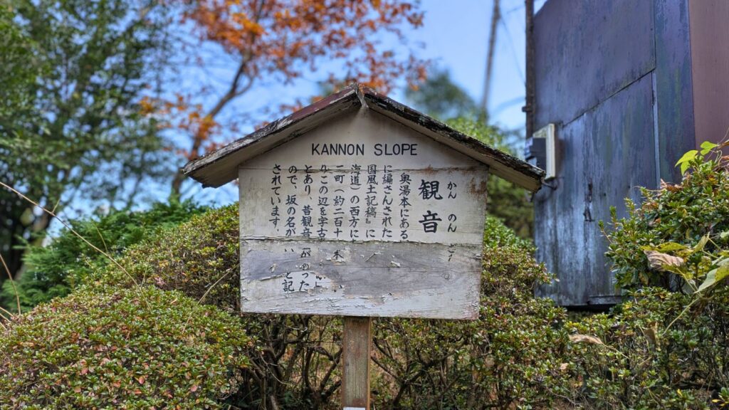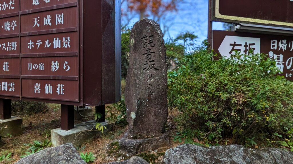 「観音坂 登リ二町許」と刻まれた古い石碑が立っています。「観音坂」という名は、かつてこの付近に「観音堂」があったことに由来します。息が上がるほどの勾配ですが、名前のおかげで少し守られている気分にもなれます。
