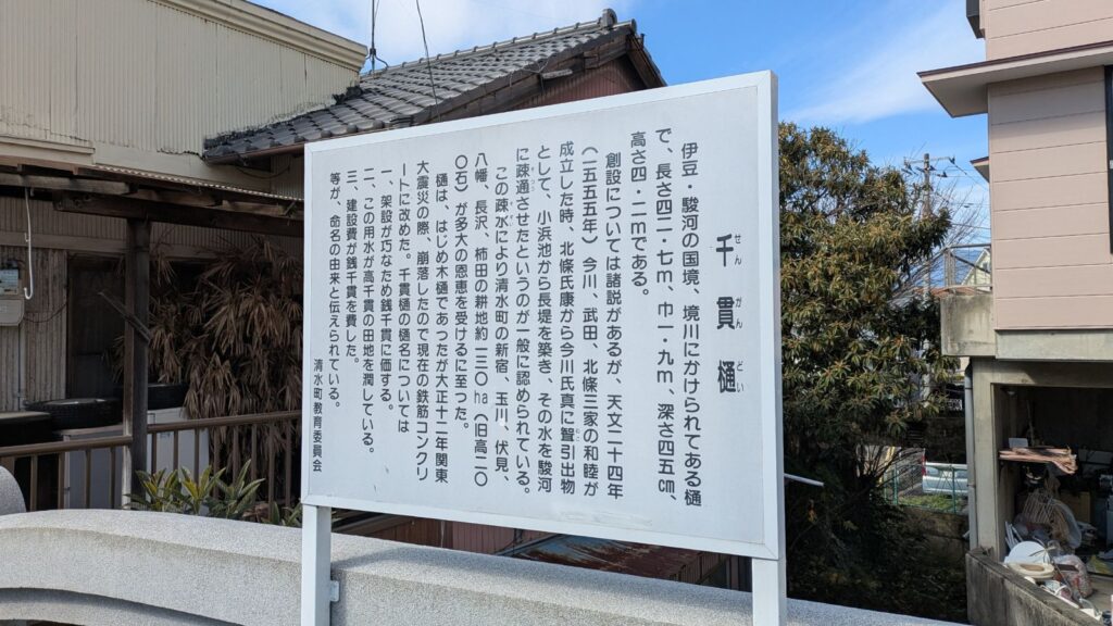 三島と清水町の境を流れる境川。そこに架かるのが、農業用の水道橋「千貫樋」です。戦国時代、北条氏康から今川氏真への結納品として贈られたというロマン溢れる説や、その価値が千貫(今の価値で数億円!)に匹敵したという説など、名前の由来だけでも酒の肴になりそうです。現在はコンクリート製になっていますが、今もなお現役で水を運び続けている姿には感動です。