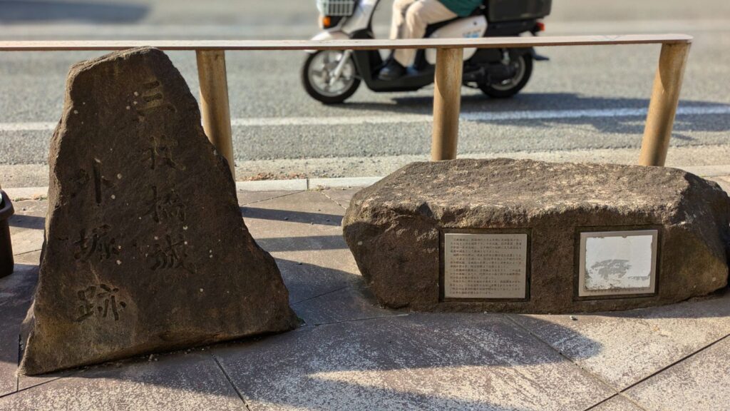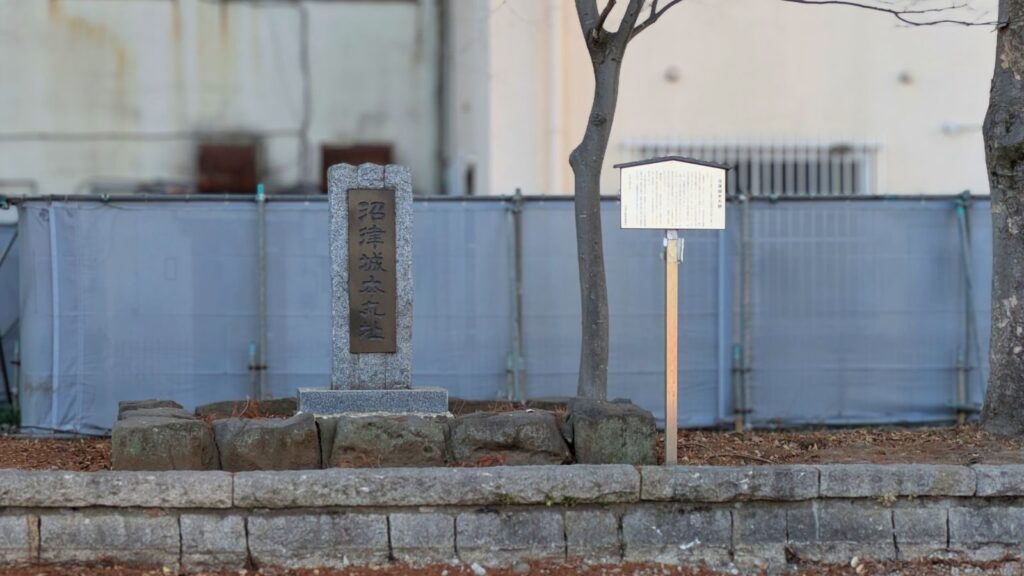 沼津中央公園にやってきました。ここはかつて、武田勝頼が築いた「三枚橋城」、江戸時代初期に一度廃城となり、その跡地に水野氏が築いた「沼津城」の本丸があった場所です。公園の再整備工事中で、石碑と案内板は遠くからの撮影です。
