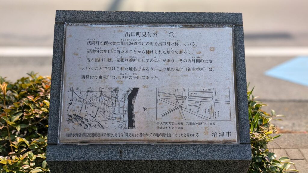 丸子神社 浅間神社から200mほど西側にある「出口町見付外」に到着しました。ここは沼津宿の西の境界線の外側。かつては土塁や柵が設けられ、宿場への出入りを厳しく管理していました。