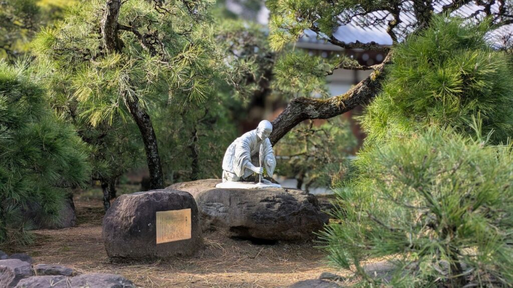境内には、沼津をこよなく愛し、千本松原の保存運動にも尽力した国民的歌人・若山牧水のお墓や、後述する千本松原の再生に一生を捧げた増誉上人の像が建っています。沼津の歴史の重要な転換点が、この静かなお寺に集約されていると言っても過言ではありません。山門をくぐると、見事にお手入れされた美しい枯山水の庭が広がり、時が止まったかのような静寂に包まれます。