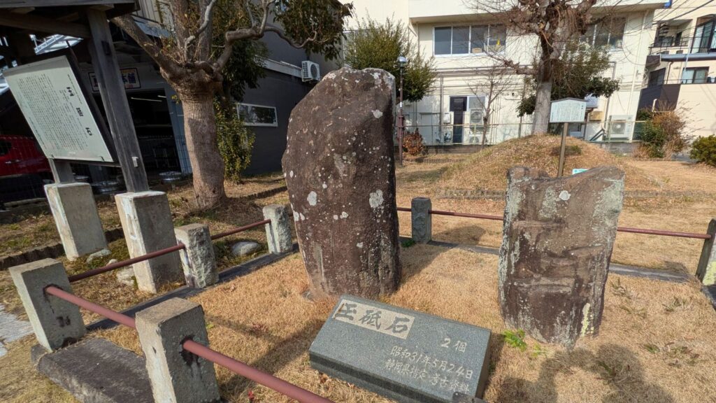 更に、公園内には静岡県指定有形文化財である「玉砥石」が設置されています。大小2基の石柱があります。これは単なる石ではなく、古代の装飾品である「玉(勾玉、管玉など)」を製作する工程で使用された、歴史的に極めて価値の高い石造遺物です。今から約1,200〜1,300年前(古墳時代〜奈良時代)に、この地は「玉造郷(たまつくりごう)」と呼ばれていたようです。