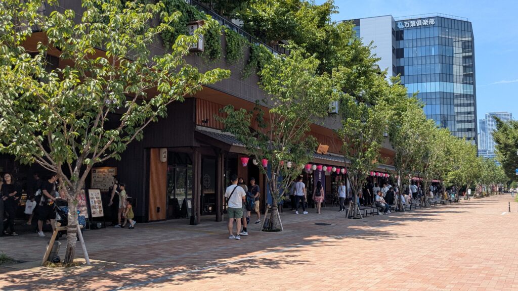 豊洲市場に近づくと、まるで江戸の街並みにタイムスリップしたような建物が!ここは、2024年にオープンしたばかりの新しいスポット「豊洲 千客万来」です。新鮮な海の幸を使った寿司や海鮮丼はもちろん、スイーツや食べ歩きグルメのお店がずらり。どこから見ても美味しそうで、さっきタコスを食べたばかりなのに、もうお腹が鳴りそうです。