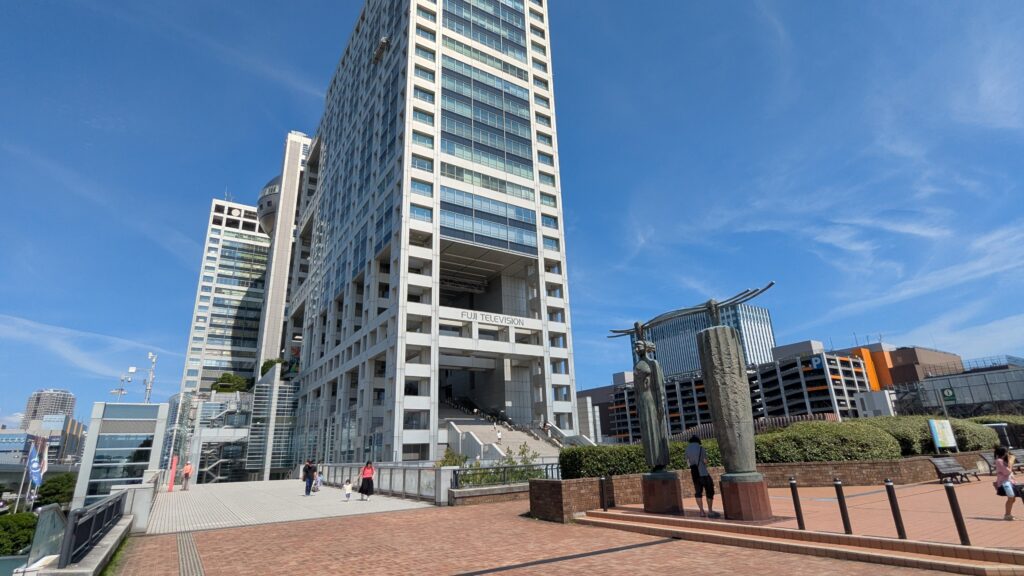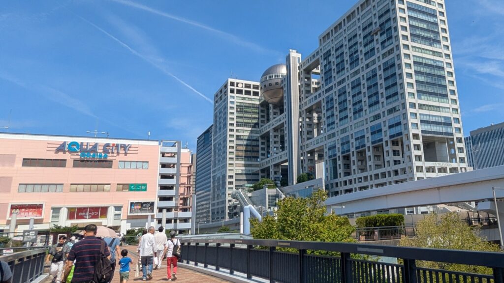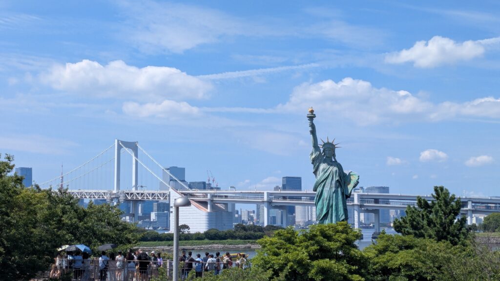 駅を降りてすぐ、まず私たちを出迎えてくれるのはアクアシティお台場とフジテレビ。そして凛々しい立ち姿の「自由の女神像」!ニューヨークの自由の女神像を模して作られたそうで、背景にそびえるレインボーブリッジとのツーショットは、まさに東京を代表する絶景です。