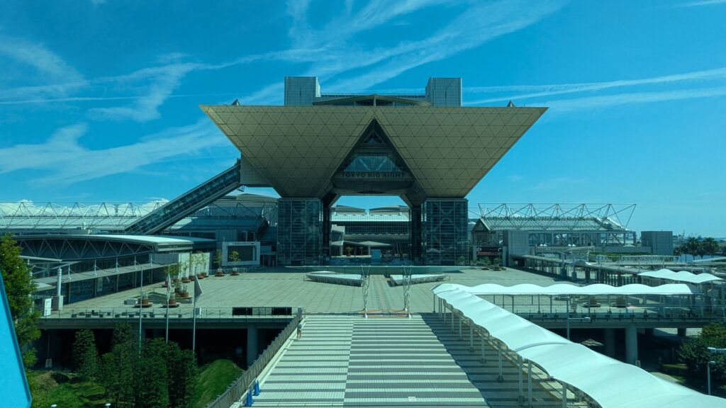 東京ビッグサイト駅からは、特徴的な逆三角形のビッグサイトを正面に見ることができます。ヴィーナスフォートやパレットタウン跡地など、かつてのお台場の賑わいを象徴する場所なんかも見えます。東京湾の美しい景色が広がり、まるで空中を散歩しているような気分です。刻々と変わる景色に目を奪われていると、あっという間に台場駅に到着です。
