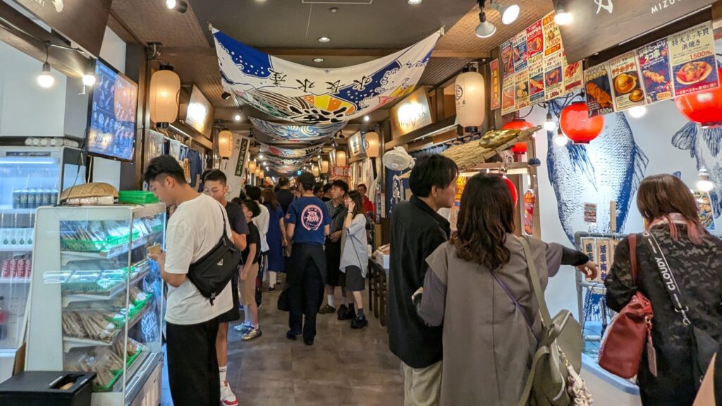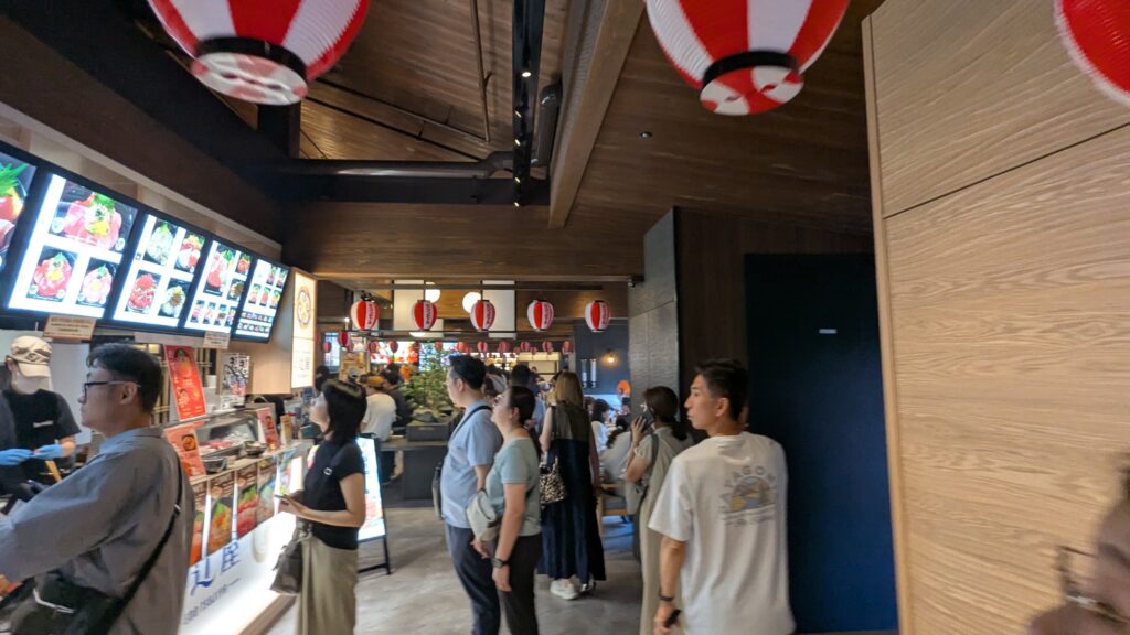 施設全体が非常にテーマパーク的で活気があり、歩いているだけで楽しい気分になりました。しかし、正直なところ、多くの店舗がインバウンド観光客をターゲットにしている印象が強く、価格設定は少し高めかな感じました。特に海鮮丼や寿司は、場所柄期待してしまいますが、一部では「観光地価格」という声も聞かれます。