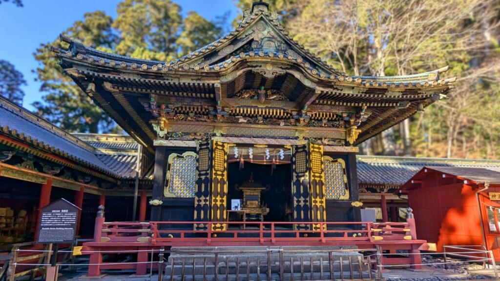 奥社拝殿は黒漆で塗られた建物で、かつては歴代将軍のみが昇段を許されていた特別な場所です。この拝殿は、奥にある宝塔に眠る家康公に祈りを捧げるための場所として重要な役割を果たしていました。
