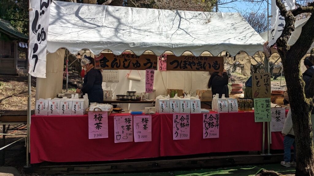 梅林の入口にあるテントで「合格まんじゅう」「つぼやきいも」「梅茶」が販売されていましたよ。