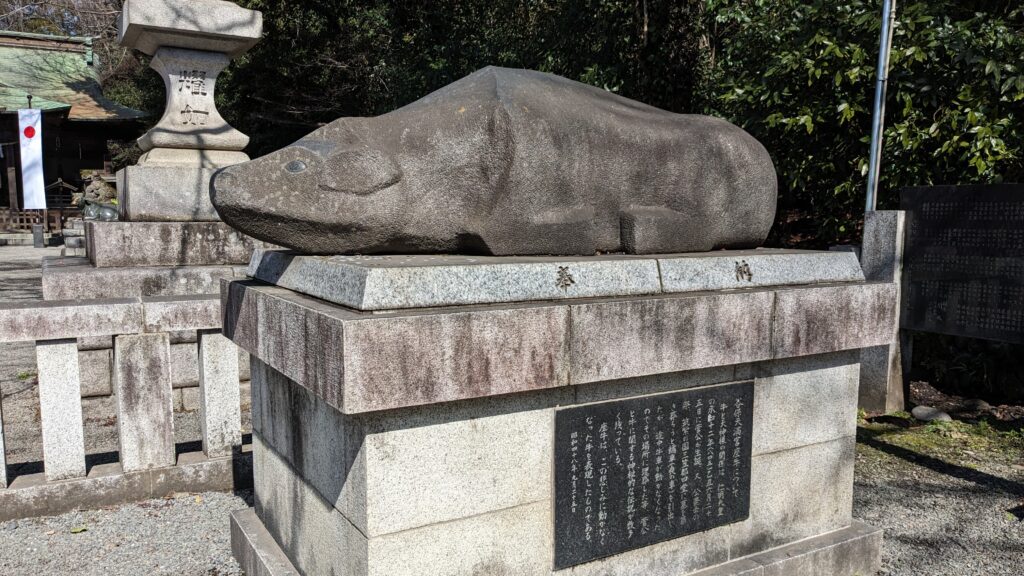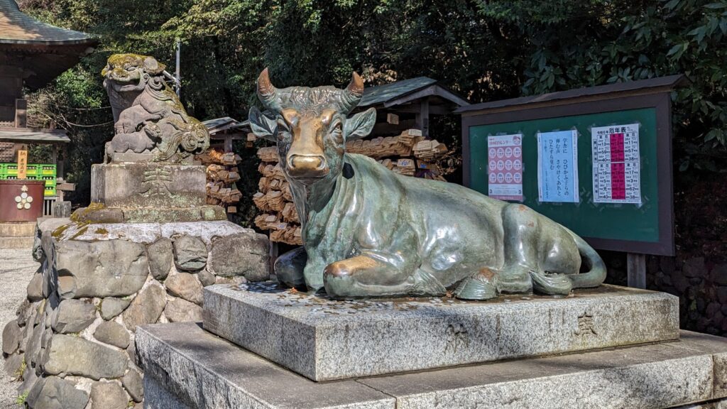 拝殿前にももう一体撫で牛の像があります。撫でられすぎてピカピカですね。